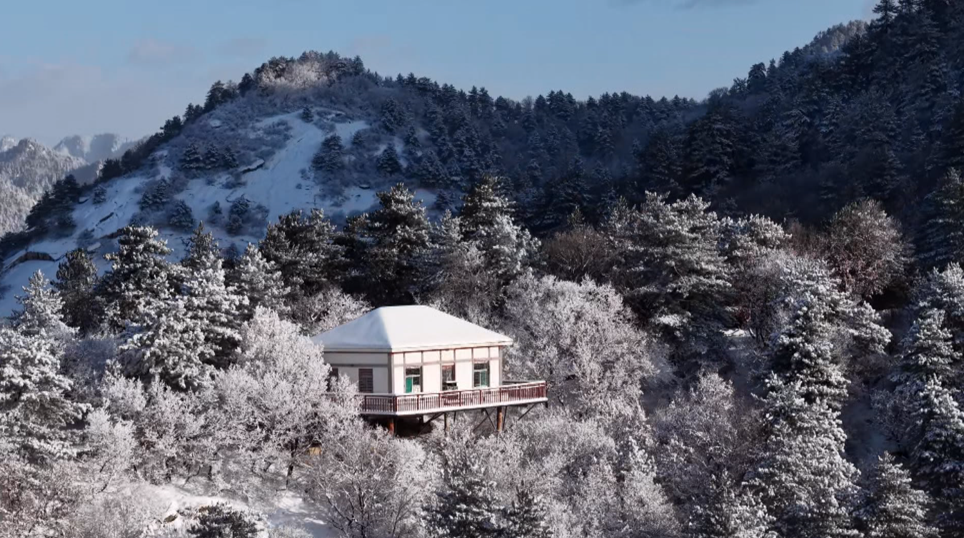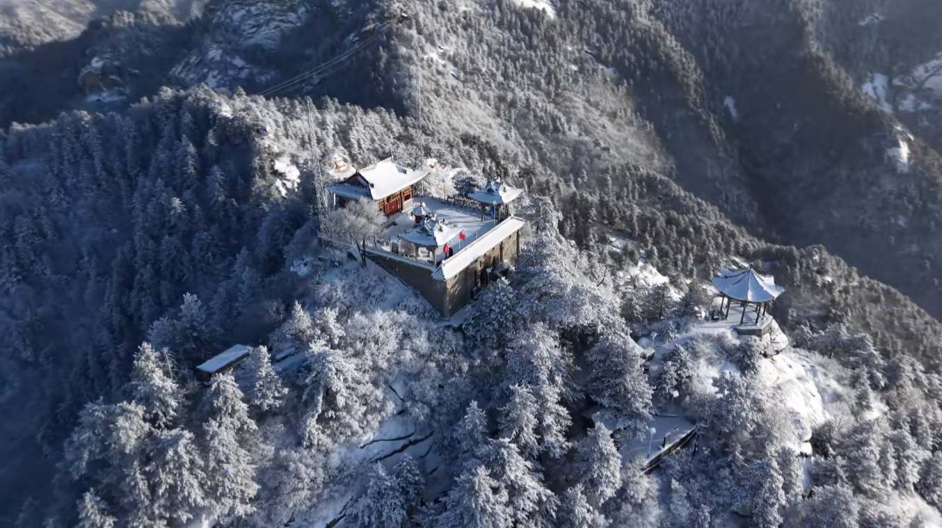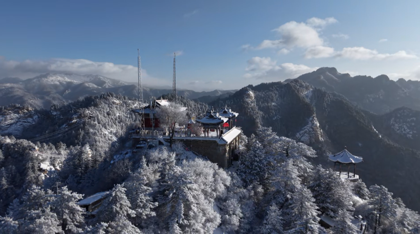 近日,国家级风景名胜区北武当山迎来降雪过后的晴好天气,阳光普照之下,漫山雪凇景致壮观,从空中俯瞰,整座山体银装素裹、层次分明,尽显冬日独特风貌。