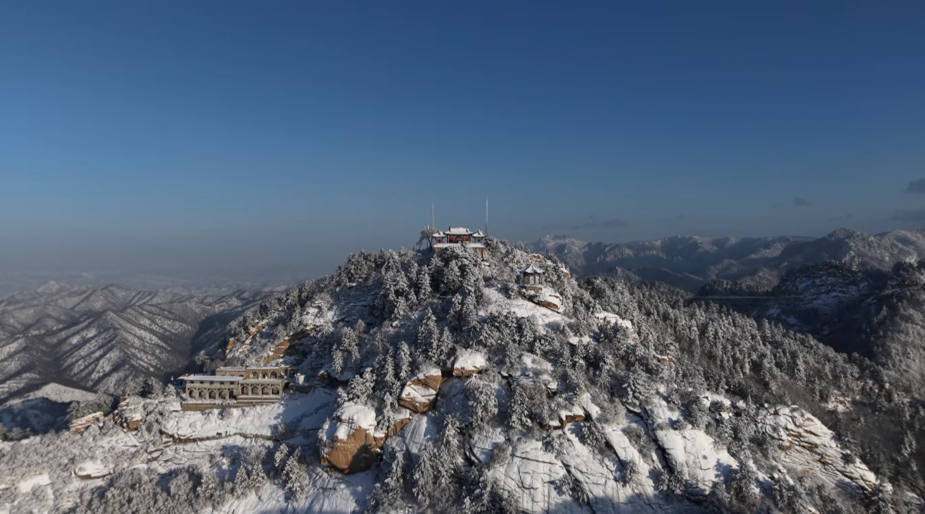 空中俯瞰可见,北武当山的峰峦、林木、山间建筑被白雪全覆盖,无一处裸露,阳光照射下,积雪表面反射出细碎的光,无云雾遮挡,整座山体的景致一目了然,远处峰峦连绵不绝,近处雪凇密集整齐,高低错落、疏密有致,构成一幅简洁而壮观的北国冬日画卷。