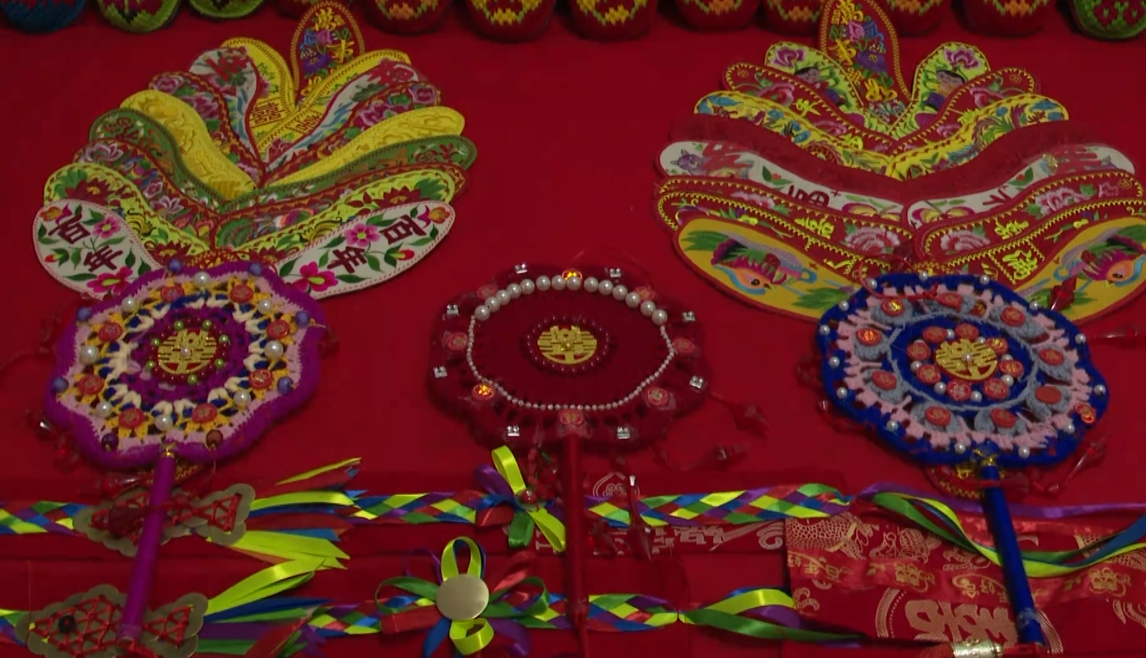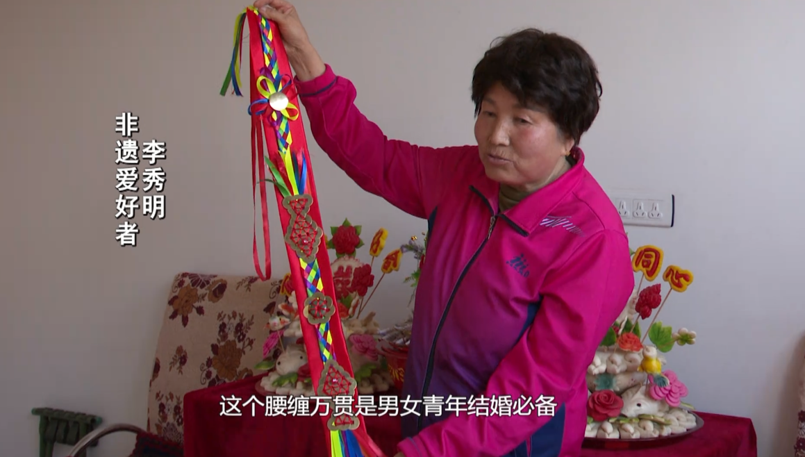 为了让非遗文化更好地融入时代活力,让更多年轻人感受非遗文化的多样性与无限魅力,李秀明巧妙地将非物质文化遗产与我县传统婚俗紧密结合。钩织的新人娃娃身着中式喜服,“ 囍”字当头,尽显中式婚礼的喜庆;十二生肖玩偶神态鲜活,围成一圈似在为新人送上吉祥祝愿;金银硬币打造的葫芦摆件,以“福禄”谐音寄托对新人的美好期许。其中最具特色的“腰缠万贯带”,以大红绸带为底,五彩中国结、金色铜钱绣片与水钻花饰交相辉映,彩带流苏摇曳生姿,成为婚嫁场景里极具温度的非遗珍品。