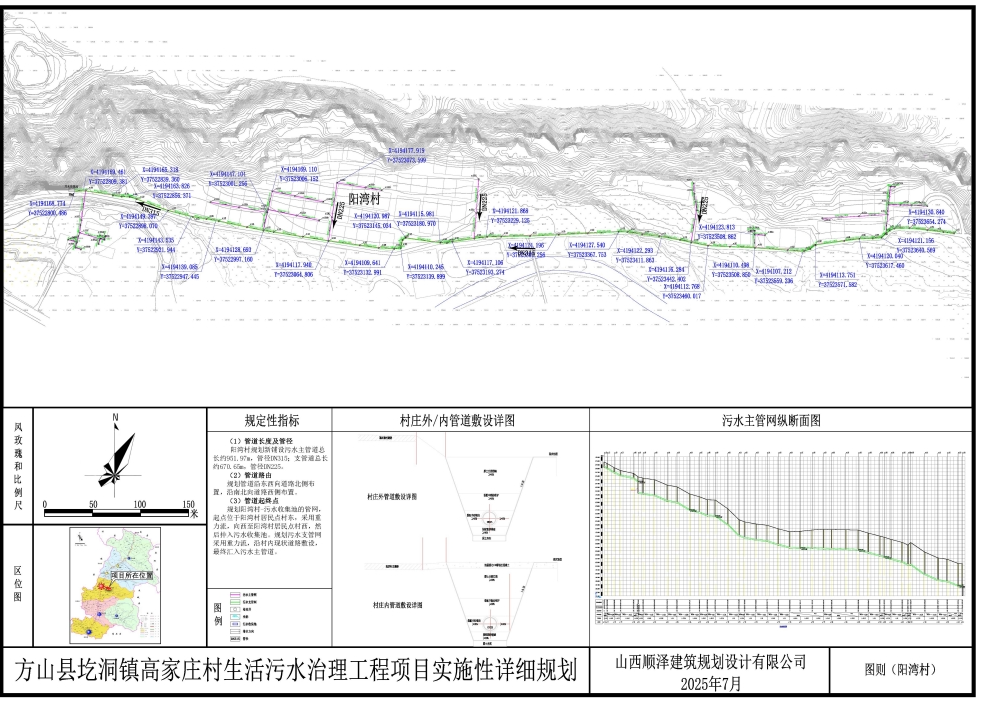 规划阳湾村-污水收集池的管网,主干管起点位于阳湾村居民点村东,采用重力流,向西至阳湾村居民点村西,然后排入污水收集池,管网总长度951.97米。