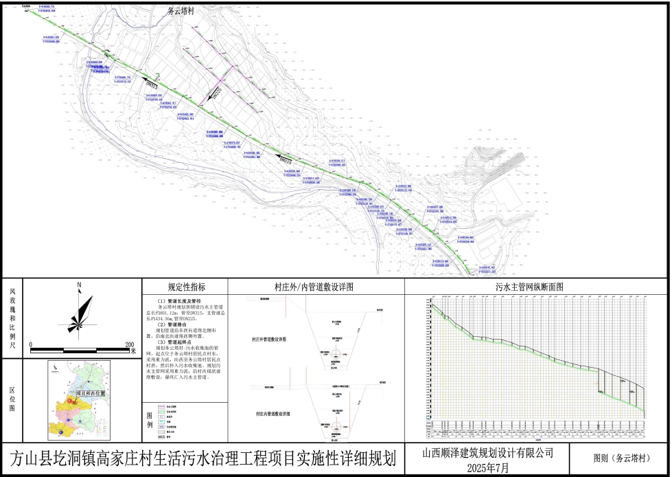 规划务云塔村-污水收集池的管网,主干管起点位于务云塔村居民点村东,采用重力流,向西至务云塔村居民点村西,然后排入污水收集池,管网总长度801.12米。