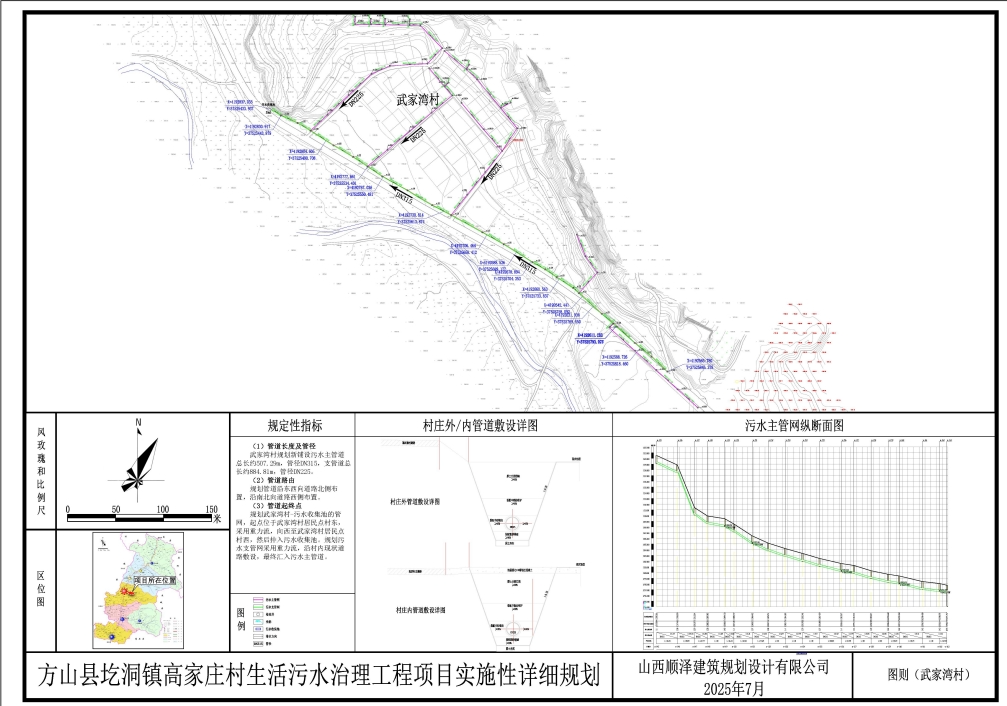 规划武家湾村-污水收集池的管网,主干管起点位于武家湾村居民点村东,采用重力流,向西至武家湾村居民点村西,然后排入污水收集池,管网总长度507.29米。