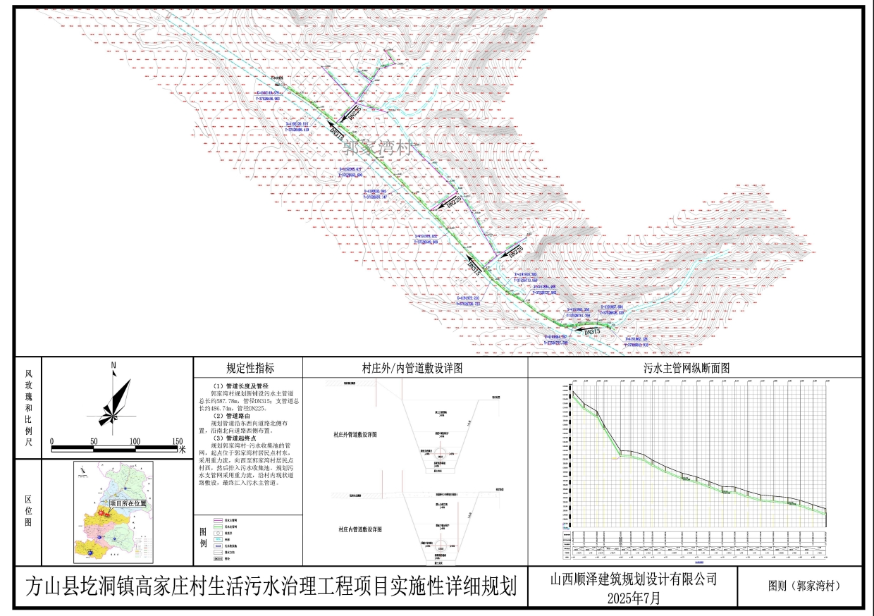 规划郭家湾村-污水收集池的管网,主干管起点位于郭家湾村居民点村东,采用重力流,向西至郭家湾村居民点村西,然后排入污水收集池,管网总长度587.78米。
