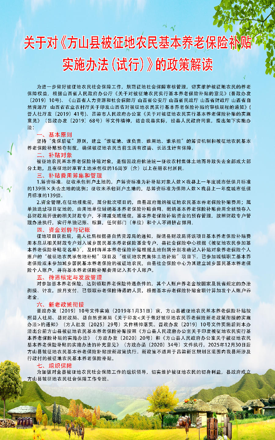 方山县人民政府办公室 关于印发方山县被征地农民基本养老保险补贴实施办法(试行)的通知