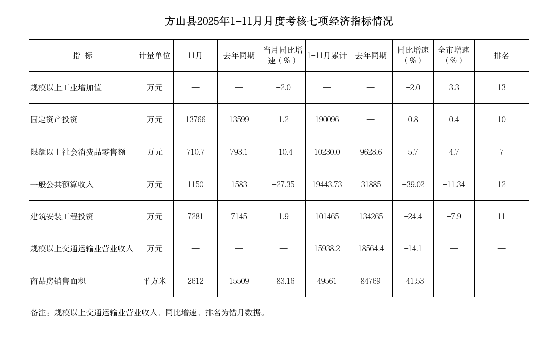 方山县2025年1-11月主要经济指标完成情况