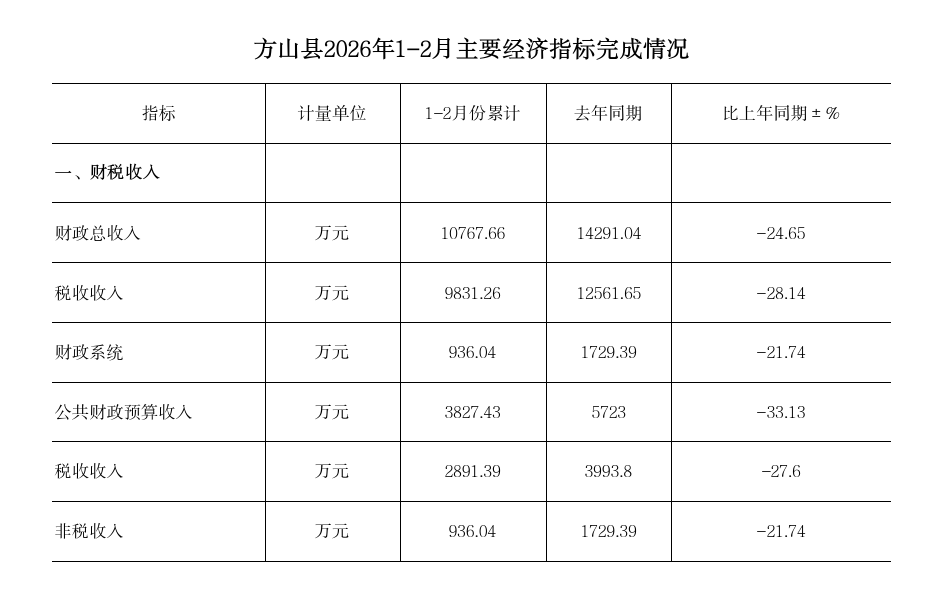 方山县2026年1-2月主要经济指标完成情况