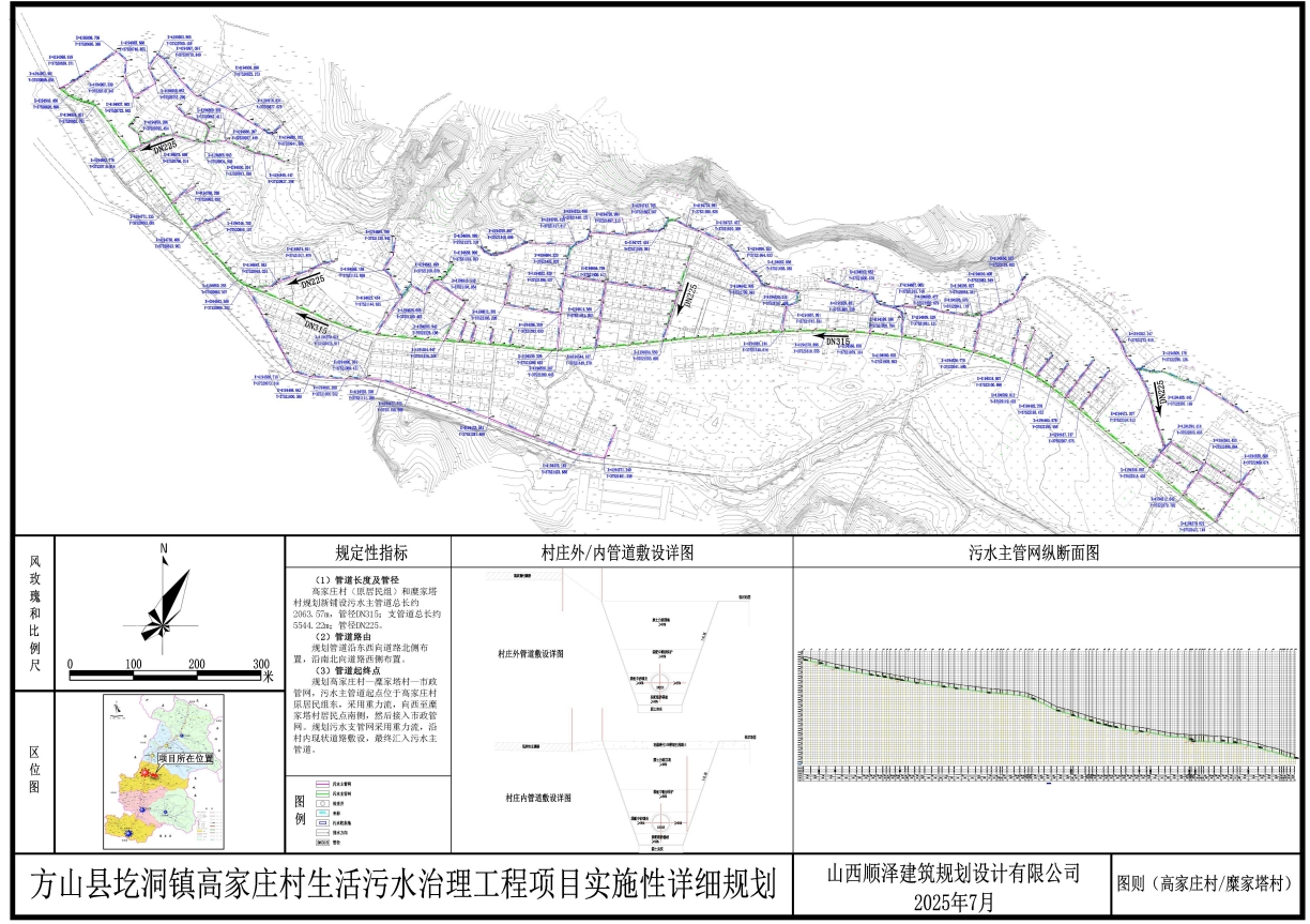 规划高家庄村一糜家塔村一市政管网,主干管起点位于高家庄村原居民组东,采用重力流,沿路敷设,向西至糜家塔村居民点南侧,然后接入市政管网,管网总长度2063.57米。