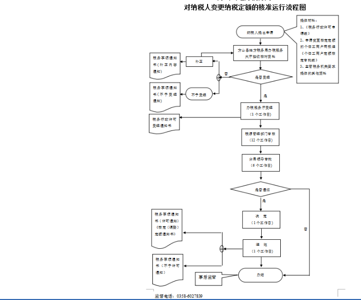 | 行政许可 | 012690950-XK-0003 | 对纳税人变更纳税定额的核准 | 【法律】《中华人民共和国税收征收管理法》第三十五条、第三十七条 【行政法规】《中华人民共和国税收征收管理法实施细则》第四十七条 |