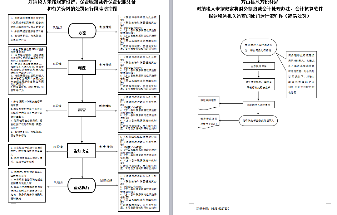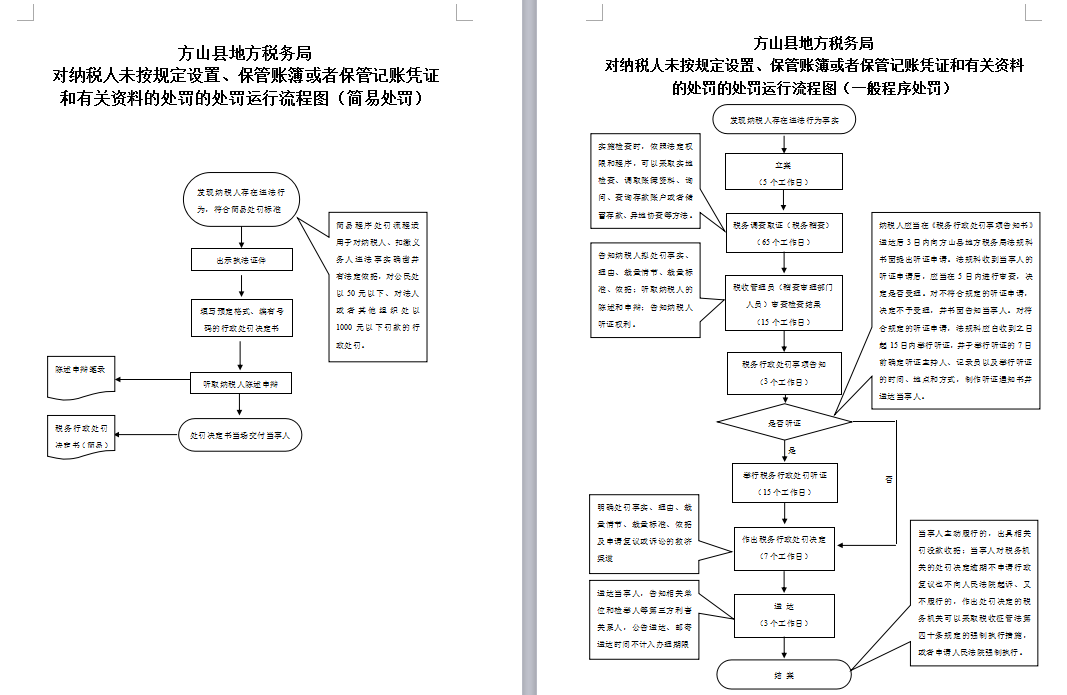 | 行政处罚 | 012690950-CF-0001 | 对违反账簿、凭证管理行为的处罚 | 对纳税人未按规定设置、保管账簿或者保管记账凭证和有关资料的处罚 | 【法律】《中华人民共和国税收征收管理法》第六十条 | 1、立案责任:税务机关根据日常管理中发现或者接到举报、控告的纳税人未按规定设置、保管账簿或者保管记账凭证和有关资料等违法行为案件,应予以审查,决定是否立案。 2、调查责任:指定专人负责,对未按规定设置、保管账簿或者保管记账凭证和有关资料等违法行为证据调查取证,与当事人有直接利害关系的应当回避。执法人员不得少于两人,调查时应出示执法证件,允许当事人辩解陈述,执法人员应保守有关秘密。制作调查检查报告。 3、审查责任:对未按规定设置、保管账簿或者保管记账凭证和有关资料等案件的违法事实、证据、调查取证程序、法律适用、处罚种类和幅度、当事人的陈述和申辩理由等方面进行审查,提出处理意见。 4、告知责任:做出未按规定设置、保管账簿或者保管记账凭证和有关资料等违法行为行政处罚决定前,应书面告知当事人违法事实及其享有的陈述、申辩、要求听证等权利。 5、决定责任:制作行政处罚决定书,载明行政处罚告知、当事人陈述申辩或者听证情况等内容。 6、送达责任:将行政处罚决定书按法律规定的方式送达当事人。 7、执行责任:将罚款在处罚决定规定的期限内追缴入库。当事人在法定期限内不申请行政复议或者提起行政诉讼,又不履行处罚决定的,税务机关可依法采取加处罚款、查封扣押或向人民法院申请强制执行等措施。 8、其他法律法规规章文件规定应履行的责任。 | 因不履行或不正确履行行政职责,有下列情形的,行政机关及相关工作人员应承担相应责任: 1、对未按规定设置、保管账簿或者保管记账凭证和有关资料等违法行为的处罚应当立案的而未立案的; 2、对应当予以处罚的违法行为不予处罚的; 3、没有法律和事实依据实施行政处罚的; 4、违反法定的行政处罚程序的; 5、指派不具备法定行政执法资格的人员实施行政处罚的; 6、随意使用自由裁量权,擅自改变行政处罚种类、幅度、范围的; 7、对当事人进行罚款不使用法定单据的; 8、应当移送司法机关处理而不移送的; 9、依法应当举行听证而不举行听证或不按规定举行听证的; 10、未在规定时限内办理税务行政复议事项的; 11、私分、挪用、截留、非法占有税款、滞纳金、罚款的; 12、凭借职权向纳税人吃、拿、卡、要,敲诈勒索的; 13、因处罚不当给当事人造成财产损失等不良后果的; 14、在行政处罚过程中滥用职权、玩忽职守、徇私舞弊的; 15、其他违反法律法规规章文件规定的行为。 | 【法律】1.《中华人民共和国行政处罚法》第七章 2.《中华人民共和国税收征收管理法》(中华人民共和国主席令第49号)第七十六至第八十五条 【党内法规】《中国共产党纪律处分条例》 【规章】《税收违法违纪行为处分规定》(监察部、人力资源社会保障部、国家税务总局令〔2012〕第26号) 【规范性文件】1.《税收执法过错责任追究办法》(国税发〔2005〕42号) 2.《山西省地方税务局税务行政过错责任追究实施办法》(晋地税发〔2006〕112号ര | 一、行政处理:1.训诫或者书面告诫; 2.责令作出书面检查; 3.通报批评; 4.调离原岗位; 5.停职离岗学习; 6.责令辞去或建议免去领导职务; 7.取消执法人员执法资格; 8.经济惩戒; 二、行政处分:包括警告、记过、记大过、降级、撤职、开除; 三、党纪处分:警告、严重警告、撤销党内职务、留党察看、开除党籍。 四、其他法律责任 | |