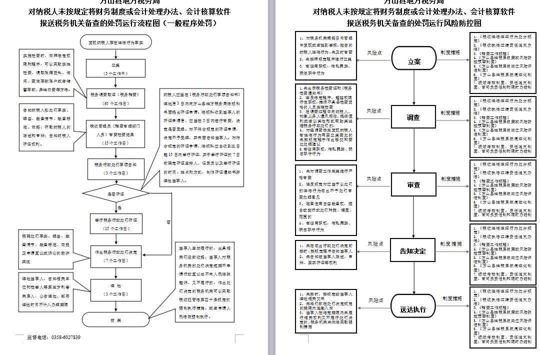 | 对纳税人未按规定将财务制度或会计处理办法、会计核算软件报送税务机关备查的处罚 | 【法律】《中华人民共和国税收征收管理法》第六十条 | 1、立案责任:税务机关根据日常管理中发现或者接到举报、控告的纳税人未按规定将财务制度或会计处理办法、会计核算软件报送税务机关备查等违法行为案件,应予以审查,决定是否立案。 2、调查责任:指定专人负责,对未按规定将财务制度等报送税务机关备查等违法行为证据调查取证,与当事人有直接利害关系的应当回避。执法人员不得少于两人,调查时应出示执法证件,允许当事人辩解陈述,执法人员应保守有关秘密。制作调查检查报告。 3、审查责任:对未按规定财务制度等报送税务机关备查等案件的违法事实、证据、调查取证程序、法律适用、处罚种类和幅度、当事人的陈述和申辩理由等方面进行审查,提出处理意见。 4、告知责任:做出未按规定财务制度等报送税务机关备查等违法行为行政处罚决定前,应书面告知当事人违法事实及其享有的陈述、申辩、要求听证等权利。 5、决定责任:制作行政处罚决定书,载明行政处罚告知、当事人陈述申辩或者听证情况等内容。 6、送达责任:将行政处罚决定书按法律规定的方式送达当事人。 7、执行责任:将罚款在处罚决定规定的期限内追缴入库。当事人在法定期限内不申请行政复议或者提起行政诉讼,又不履行处罚决定的,税务机关可依法采取加处罚款、查封扣押或向人民法院申请强制执行等措施。 8、其他法律法规规章文件规定应履行的责任。 | 因不履行或不正确履行行政职责,有下列情形的,行政机关及相关工作人员应承担相应责任: 1、对未按规定将财务制度或会计处理办法、会计核算软件报送税务机关备查等违法行为的处罚应当立案的而未立案的; 2、对应当予以处罚的违法行为不予处罚的; 3、没有法律和事实依据实施行政处罚的; 4、违反法定的行政处罚程序的; 5、指派不具备法定行政执法资格的人员实施行政处罚的; 6、随意使用自由裁量权,擅自改变行政处罚种类、幅度、范围的; 7、对当事人进行罚款不使用法定单据的; 8、应当移送司法机关处理而不移送的; 9、依法应当举行听证而不举行听证或不按规定举行听证的; 10、未在规定时限内办理税务行政复议事项的; 11、私分、挪用、截留、非法占有税款、滞纳金、罚款的; 12、凭借职权向纳税人吃、拿、卡、要,敲诈勒索的; 13、因处罚不当给当事人造成财产损失等不良后果的; 14、在行政处罚过程中滥用职权、玩忽职守、徇私舞弊的; 15、其他违反法律法规规章文件规定的行为。 | 【法律】1.《中华人民共和国行政处罚法》第七章 2.《中华人民共和国税收征收管理法》(中华人民共和国主席令第49号)第七十六至第八十五条 【党内法规】《中国共产党纪律处分条例》 【规章】《税收违法违纪行为处分规定》(监察部、人力资源社会保障部、国家税务总局令〔2012〕第26号) 【规范性文件】1.《税收执法过错责任追究办法》(国税发〔2005〕42号) 2.《山西省地方税务局税务行政过错责任追究实施办法》(晋地税发〔2006〕112号ര | 一、行政处理:1.训诫或者书面告诫; 2.责令作出书面检查; 3.通报批评; 4.调离原岗位; 5.停职离岗学习; 6.责令辞去或建议免去领导职务; 7.取消执法人员执法资格; 8.经济惩戒; 二、行政处分:包括警告、记过、记大过、降级、撤职、开除; 三、党纪处分:警告、严重警告、撤销党内职务、留党察看、开除党籍。 四、其他法律责任 | ||||