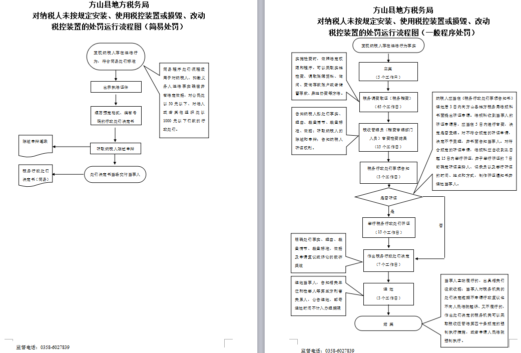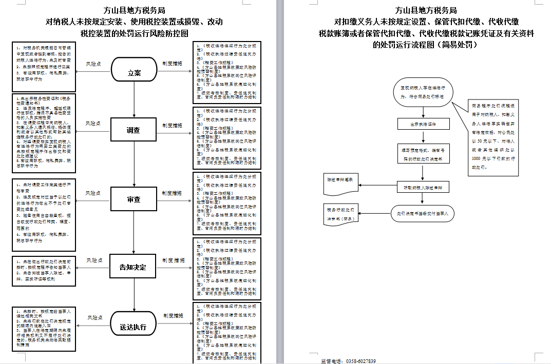 | 对纳税人未按规定安装、使用税控装置或损毁、改动税控装置的处罚 | 【法律】《中华人民共和国税收征收管理法》第六十条 | 1、立案责任:税务机关根据日常管理中发现或者接到举报、控告的纳税人未按规定安装、使用税控装置或损毁、改动税控装置等违法行为案件,应予以审查,决定是否立案。 2、调查责任:指定专人负责,对未按规定安装、使用税控装置或损毁、改动税控装置等违法行为证据调查取证,与当事人有直接利害关系的应当回避。执法人员不得少于两人,调查时应出示执法证件,允许当事人辩解陈述,执法人员应保守有关秘密。制作调查检查报告。 3、审查责任:对未按规定安装、使用税控装置或损毁、改动税控装置等案件的违法事实、证据、调查取证程序、法律适用、处罚种类和幅度、当事人的陈述和申辩理由等方面进行审查,提出处理意见。 4、告知责任:做出未按规定安装、使用税控装置或损毁、改动税控装置等违法行为行政处罚决定前,应书面告知当事人违法事实及其享有的陈述、申辩、要求听证等权利。 5、决定责任:制作行政处罚决定书,载明行政处罚告知、当事人陈述申辩或者听证情况等内容。 6、送达责任:将行政处罚决定书按法律规定的方式送达当事人。 7、执行责任:将罚款在处罚决定规定的期限内追缴入库。当事人在法定期限内不申请行政复议或者提起行政诉讼,又不履行处罚决定的,税务机关可依法采取加处罚款、查封扣押或向人民法院申请强制执行等措施。 8、其他法律法规规章文件规定应履行的责任。 | 因不履行或不正确履行行政职责,有下列情形的,行政机关及相关工作人员应承担相应责任: 1、对未按规定安装、使用税控装置或损毁、改动税控装置等违法行为的处罚应当立案的而未立案的; 2、对应当予以处罚的违法行为不予处罚的; 3、没有法律和事实依据实施行政处罚的; 4、违反法定的行政处罚程序的; 5、指派不具备法定行政执法资格的人员实施行政处罚的; 6、随意使用自由裁量权,擅自改变行政处罚种类、幅度、范围的; 7、对当事人进行罚款不使用法定单据的; 8、应当移送司法机关处理而不移送的; 9、依法应当举行听证而不举行听证或不按规定举行听证的; 10、未在规定时限内办理税务行政复议事项的; 11、私分、挪用、截留、非法占有税款、滞纳金、罚款的; 12、凭借职权向纳税人吃、拿、卡、要,敲诈勒索的; 13、因处罚不当给当事人造成财产损失等不良后果的; 14、在行政处罚过程中滥用职权、玩忽职守、徇私舞弊的; 15、其他违反法律法规规章文件规定的行为。 | 【法律】1.《中华人民共和国行政处罚法》第七章 2.《中华人民共和国税收征收管理法》(中华人民共和国主席令第49号)第七十六至第八十五条 【党内法规】《中国共产党纪律处分条例》 【规章】《税收违法违纪行为处分规定》(监察部、人力资源社会保障部、国家税务总局令〔2012〕第26号) 【规范性文件】1.《税收执法过错责任追究办法》(国税发〔2005〕42号) 2.《山西省地方税务局税务行政过错责任追究实施办法》(晋地税发〔2006〕112号ര | 一、行政处理:1.训诫或者书面告诫; 2.责令作出书面检查; 3.通报批评; 4.调离原岗位; 5.停职离岗学习; 6.责令辞去或建议免去领导职务; 7.取消执法人员执法资格; 8.经济惩戒; 二、行政处分:包括警告、记过、记大过、降级、撤职、开除; 三、党纪处分:警告、严重警告、撤销党内职务、留党察看、开除党籍。 四、其他法律责任 | ||||