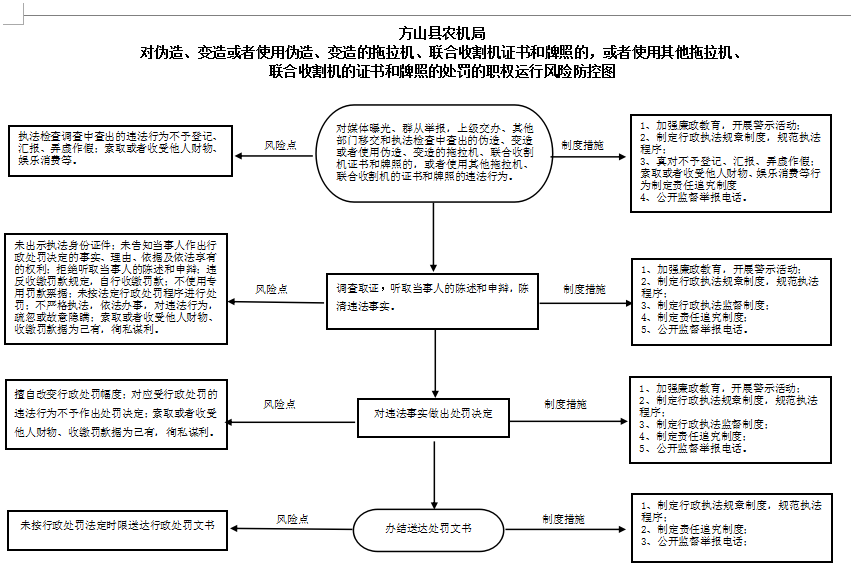 | 行政处罚 | 779565397-CF-0002 | 对伪造、变造或者使用伪造、变造的拖拉机、联合收割机证书和牌照的,或者使用其他拖拉机、联合收割机的证书和牌照的处罚 | 【行政法规】《农业机械安全监督管理条例》(国务院令第563号)第五十一条。 | 1、受理阶段责任:对媒体曝光、群众举报、上级交办、其他部门移交和执法检查中查出的违法行为进行登记、汇报。 2、承办阶段责任:依法实施行政处罚;执法人员不得少于2人;向当事人出示执法证件;告知作出处罚决定的事实、理由、依据及享有的权力;听取当事人陈述和申辩;制作行政处罚决定书;按法定程序进行处罚;严格执行收缴罚款规定。 3、决定阶段责任;依法作出行政处罚决定或者不予行政处罚决定。 4、送达阶段责任:将处罚决定书当场交付当事人,当事人不在场的7日内送达当事人。 | 1、对媒体曝光、群众举报,上级交办、其他部门移交和执法检查中查出的违法行为不予登记、汇报的; 2、未按法定行政处罚程序进行处罚的; 3、违反收缴罚款规定,自行收缴罚款的; 4、擅自改变行政处罚幅度的; 5、在处理违法行为时,索取或者收受他人财物、收缴罚款据为己有,徇私谋利的; 6、对应受行政处罚的违法行为不予作出处罚决定,不依法履行监管职责或者履责不力,致使出现重大安全隐患的; 7、工作中滥用职权、徇私舞弊的; 8、其他违反法律法规规章文件规定的行为。 | 【法律】《公务员法》第五十三条、第五十四条、第五十五条 【行政法规】《农业机械安全监督管理条例》(国务院令第563号)第四十五条; 【行政法规】《行政机关公务员处分条例》(国务院令第495号)第六条、第七条 【行政法规】《事业单位人事管理条例》(国务院令第652号)第二十八条、第二十九条 【党内法规】《中国共产党纪律处分条例》第九条、第十条 【规范性文件】《吕梁市行政执法责任追究暂行办法》第八条、第二十三条、第二十四条、第二十五条。 | (一)行政处理:责令作出书面检查;通报批评;暂扣或者吊销行政执法证件;调离行政执法岗位;国家、省规定的其它行政处理种类。 (二)行政处分:警告;记过;记大过;降级;撤职;开除。 (三)党纪处分:警告;严重警告;撤销党内职务;留党察看;开除党籍。 (四)法律责任:构成犯罪的,依法追究刑事责任。 | 保留 | |