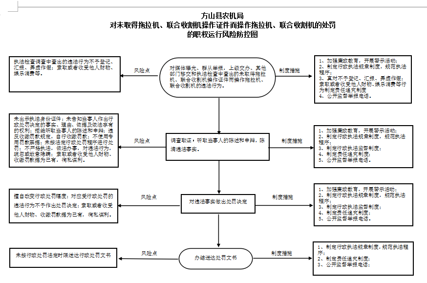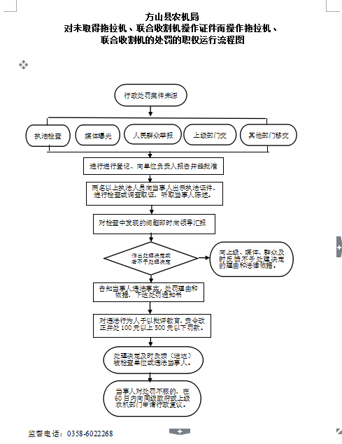 | 行政处罚 | 779565397-CF-0003 | 对未取得拖拉机、联合收割机操作证件而操作拖拉机、联合收割机的处罚 | 【行政法规】《农业机械安全监督管理条例》(国务院令第563号)第五十二条; 【地方性法规】《山西省农业机械化条例》第四十二条。 | 1、受理阶段责任:对媒体曝光、群众举报、上级交办、其他部门移交和执法检查中查出的违法行为进行登记、汇报。 2、承办阶段责任:依法实施行政处罚;执法人员不得少于2人;向当事人出示执法证件;告知作出处罚决定的事实、理由、依据及享有的权力;听取当事人陈述和申辩;制作行政处罚决定书;按法定程序进行处罚;严格执行收缴罚款规定。 3、决定阶段责任;依法作出行政处罚决定或者不予行政处罚决定。 4、送达阶段责任:将处罚决定书当场交付当事人,当事人不在场的7日内送达当事人。 | 1、对媒体曝光、群众举报,上级交办、其他部门移交和执法检查中查出的违法行为不予登记、汇报的; 2、未按法定行政处罚程序进行处罚的; 3、违反收缴罚款规定,自行收缴罚款的; 4、擅自改变行政处罚幅度的; 5、在处理违法行为时,索取或者收受他人财物、收缴罚款据为己有,徇私谋利的; 6、对应受行政处罚的违法行为不予作出处罚决定,不依法履行监管职责或者履责不力,致使出现重大安全隐患的; 7、工作中滥用职权、徇私舞弊的; 8、其他违反法律法规规章文件规定的行为。 | 【法律】《公务员法》第五十三条、第五十四条、第五十五条 【行政法规】《农业机械安全监督管理条例》(国务院令第563号)第四十五条; 【行政法规】《行政机关公务员处分条例》(国务院令第495号)第六条、第七条 【行政法规】《事业单位人事管理条例》(国务院令第652号)第二十八条、第二十九条 【党内法规】《中国共产党纪律处分条例》第九条、第十条 【地方性法规】《山西省农业机械化条例》第四十四条; 【规范性文件】《吕梁市行政执法责任追究暂行办法》第八条、第二十三条、第二十四条、第二十五条。 | (一)行政处理:责令作出书面检查;通报批评;暂扣或者吊销行政执法证件;调离行政执法岗位;国家、省规定的其它行政处理种类。 (二)行政处分:警告;记过;记大过;降级;撤职;开除。 (三)党纪处分:警告;严重警告;撤销党内职务;留党察看;开除党籍。 (四)法律责任:构成犯罪的,依法追究刑事责任。 | 保留 | |