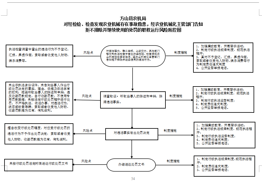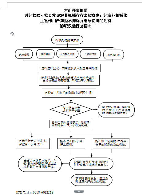 | 行政处罚 | 779565397-CF-0006 | 对经检验、检查发现农业机械存在事故隐患,经农业机械化主管部门告知拒不排除并继续使用的处罚 | 【行政法规】《农业机械安全监督管理条例》(国务院令第563号)第五十五条。 | 1、受理阶段责任:对媒体曝光、群众举报、上级交办、其他部门移交和执法检查中查出的违法行为进行登记、汇报。 2、承办阶段责任:依法实施行政处罚;执法人员不得少于2人;向当事人出示执法证件;告知作出处罚决定的事实、理由、依据及享有的权力;听取当事人陈述和申辩;制作行政处罚决定书;按法定程序进行处罚;严格执行收缴罚款规定。 3、决定阶段责任;依法作出行政处罚决定或者不予行政处罚决定。 4、送达阶段责任:将处罚决定书当场交付当事人,当事人不在场的7日内送达当事人。 | 1、对媒体曝光、群众举报,上级交办、其他部门移交和执法检查中查出的违法行为不予登记、汇报的; 2、未按法定行政处罚程序进行处罚的; 3、违反收缴罚款规定,自行收缴罚款的; 4、擅自改变行政处罚幅度的; 5、在处理违法行为时,索取或者收受他人财物、收缴罚款据为己有,徇私谋利的; 6、对应受行政处罚的违法行为不予作出处罚决定,不依法履行监管职责或者履责不力,致使出现重大安全隐患的; 7、工作中滥用职权、徇私舞弊的; 8、其他违反法律法规规章文件规定的行为。 | 【法律】《公务员法》第五十三条、第五十四条、第五十五条 【行政法规】《农业机械安全监督管理条例》(国务院令第563号)第四十五条; 【行政法规】《行政机关公务员处分条例》(国务院令第495号)第六条、第七条 【行政法规】《事业单位人事管理条例》(国务院令第652号)第二十八条、第二十九条 【党内法规】《中国共产党纪律处分条例》第九条、第十条 【规范性文件】《吕梁市行政执法责任追究暂行办法》第八条、第二十三条、第二十四条、第二十五条。 | (一)行政处理:责令作出书面检查;通报批评;暂扣或者吊销行政执法证件;调离行政执法岗位;国家、省规定的其它行政处理种类。 (二)行政处分:警告;记过;记大过;降级;撤职;开除。 (三)党纪处分:警告;严重警告;撤销党内职务;留党察看;开除党籍。 (四)法律责任:构成犯罪的,依法追究刑事责任。 | 保留 | |