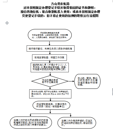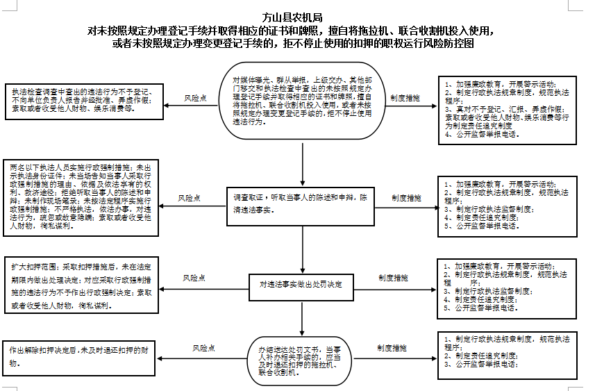 | 行政强制 | 779565397-QZ-0001 | 对未按照规定办理登记手续并取得相应的证书和牌照,擅自将拖拉机、联合收割机投入使用,或者未按照规定办理变更登记手续的,拒不停止使用的扣押 | 【行政法规】《农业机械安全监督管理条例》(国务院令第563号)第五十条。 | 1、受理阶段责任:对媒体曝光、群众举报、上级交办、其他部门移交和执法检查中查出的违法行为进行登记、向单位负责人报告并经批准。 2、承办阶段责任:依法实施行政强制措施;执法人员不得少于2人;出示执法身份证件;通知当事人到场(当事人不到场的,邀请见证人到场);当场告知当事人采取行政强制措施的理由、依据及享有的权力、救济途径;听取当事人陈述和申辩;制作现场笔录;当事人(或者见证人)和执法人员在笔录上签名或者盖章;制作并当场交付行政强制决定书。 3、决定阶段责任;依法作出行政强制决定或者不予行政强制决定、解除行政强制决定。 4、送达阶段责任:当场交付行政强制决定书;作出解除扣押决定后,立即退还扣押的财物。 | 1、对媒体曝光、群众举报,上级交办、其他部门移交和执法检查中查出的违法行为不予登记、不向单位负责人报告并经批准的; 2、未按法定程序实施行政强制的; 3、扩大扣押范围的; 4、使用或者损毁扣押财物的; 5、在扣押法定期间不作出处理决定或者未依法及时解除扣押的; 6、作出解除扣押决定后,未及时退还扣押财物的; 7、索取或者收受他人财物,徇私谋利的; 8、不依法履行监管职责,对违法行为,疏忽或故意隐瞒,不予作出行政强制决定,致使违法行为继续存在的; 9、工作中滥用职权、徇私舞弊的; 10、其他违反法律法规规章文件规定的行为。 | 【法律】《公务员法》第五十三条、第五十四条、第五十五条 【行政法规】《农业机械安全监督管理条例》(国务院令第63号)第四十五条; 【行政法规】《行政机关公务员处分条例》(国务院令第495号)第六条、第七条 【行政法规】《事业单位人事管理条例》(国务院令第652号)第二十八条、第二十九条 【党内法规】《中国共产党纪律处分条例》第九条、第十条 【规范性文件】《吕梁市行政执法责任追究暂行办法》第九条、第二十三条、第二十四条、第二十五条。 | (一)行政处理:责令作出书面检查;通报批评;暂扣或者吊销行政执法证件;调离行政执法岗位;国家、省规定的其它行政处理种类。 (二)行政处分:警告;记过;记大过;降级;撤职;开除。 (三)党纪处分:警告;严重警告;撤销党内职务;留党察看;开除党籍。 (四)法律责任:构成犯罪的,依法追究刑事责任。 | 保留 | |