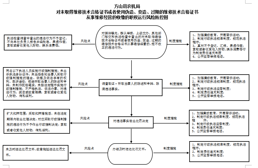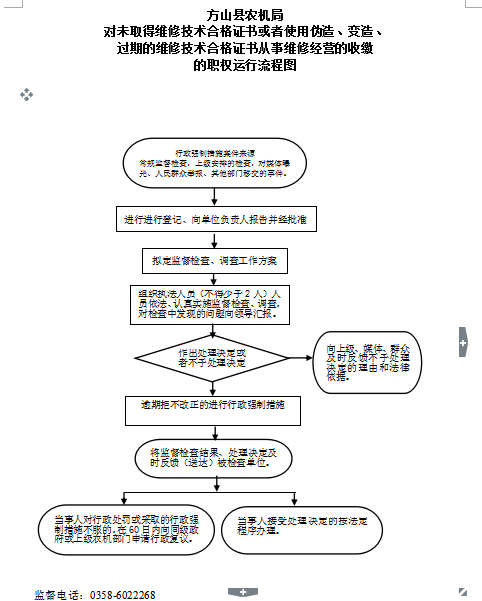 | 行政强制 | 779565397-QZ-0005 | 对未取得维修技术合格证书或者使用伪造、变造、过期的维修技术合格证书从事维修经营的收缴 | 【行政法规】《农业机械安全监督管理条例》(国务院令第563号)第四十八条; 【部门规章】《农业机械维修管理规定》(农业部工商行总局令第57号)第二十四条。 | 1、受理阶段责任:对媒体曝光、群众举报、上级交办、其他部门移交和执法检查中查出的违法行为进行登记、向单位负责人报告并经批准。 2、承办阶段责任:依法实施行政强制措施;执法人员不得少于2人;出示执法身份证件;通知当事人到场(当事人不到场的,邀请见证人到场);当场告知当事人采取行政强制措施的理由、依据及享有的权力、救济途径;听取当事人陈述和申辩;制作现场笔录;当事人(或者见证人)和执法人员在笔录上签名或者盖章;制作并当场交付行政强制决定书。 3、决定阶段责任;依法作出行政强制决定或者不予行政强制决定、解除行政强制决定。 4、送达阶段责任:当场交付行政强制决定书;作出解除罚款决定后,立即退还罚款款项。 | 1、对媒体曝光、群众举报,上级交办、其他部门移交和执法检查中查出的违法行为不予登记、不向单位负责人报告并经批准的; 2、未按法定程序实施行政强制的; 3、扩大罚款范围的; 4、作出解除罚款决定后,未及时退还所罚款项的; 5、索取或者收受他人财物,徇私谋利的; 6、不依法履行监管职责,对违法行为,疏忽或故意隐瞒,不予作出行政强制决定,致使违法行为继续存在的; 7、工作中滥用职权、徇私舞弊的; 8、其他违反法律法规规章文件规定的行为。 | 【法律】《公务员法》第五十三条、第五十四条、第五十五条 【行政法规】《农业机械安全监督管理条例》(国务院令第563号)第四十五条; 【行政法规】《行政机关公务员处分条例》(国务院令第495号)第六条、第七条 【行政法规】《事业单位人事管理条例》(国务院令第652号)第二十八条、第二十九条 【党内法规】《中国共产党纪律处分条例》第九条、第十条 【地方性法规】《山西省农业机械化条例》第四十四条; 【部门规章】《农业机械维修管理规定》(农业部工商行总局令第57号)第二十九条 【规范性文件】《吕梁市行政执法责任追究暂行办法》第九条、第二十三条、第二十四条、第二十五条。 | (一)行政处理:责令自行纠正或者限期改正;取消当年评比先进的资格;诫勉谈话或者责令书面检讨;通报批评;暂扣行政执法证件;责令离岗培训;调离行政执法岗位;取消执法资格。 (二)行政处分:警告;记过;记大过;降级;撤职;开除。 (三)党纪处分:警告;严重警告;撤销党内职务;留党察看;开除党籍。 (四)法律责任:构成犯罪的,依法追究刑事责任。 | 保留 | |