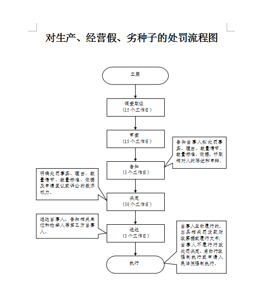 1.立案责任:符合条件的予以立案,对材料不全的,一次性告知所需材料。 2.调查责任:遵循客观事实,对应该取证的进行取证。 3.审查责任:对取证材料进行认真审查核实,需补充取证的及时补证。 4.告知责任:在规定时间内告知被处罚单位处罚理由。作出行政处罚决定前,应制作《行政处罚听证告知书》送达当事人,告知违法事实及其享有的陈述、申辩等权利。 5.决定责任:作出行政处罚决定应严格审查。制作行政处罚决定书,应载明必备内容。 6.送达责任:行政处罚决定书按法律规定的方式送达当事人。 7.执行责任:依照生效的行政处罚决定采取执行措施。 8.其他:法律法规规章规定应履行的责任。 |