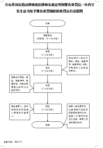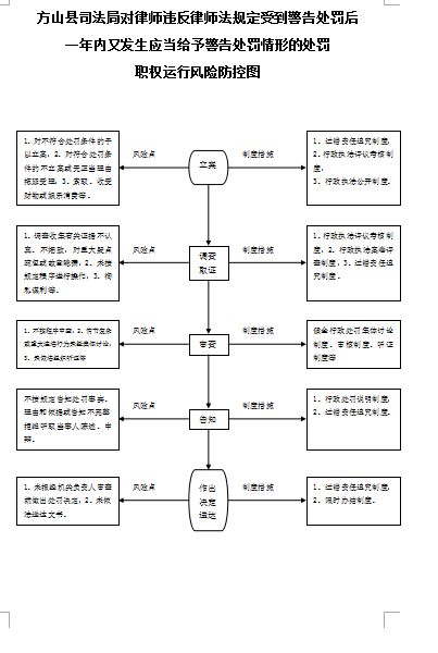 | 行政处罚 | 01269077-4 -CF-0005 | 对律师违反律师法规定受到警告处罚后一年内又发生应当给予警告处罚情形的处罚 | 【法律】《中华人民共和国律师法》第五十一条第一款 | 1、立案责任:发现和受理移交的违法行为,予以审查,决定是否立案。2、调查责任:立案的,指定专人负责,及时组织调查取证,与当事人有直接利害关系的应当回避。执法人员不得少于两人,调查时应出示执法证件,允许当事人辩解陈述。执法人员廉洁奉公保守有关秘密。 3、审查责任;审查案件调查报告,对案件违法事实、证据、调查取证程序、法律适用、处罚种类和幅度、当事人陈述和申辩理由等方面进行审查,提出处理意见(主要证据不足时,以适当的方式补充调查)。4、告知责任:作出行政处罚决定前,应制作《行政处罚告知书》送达当事人,告知违法事实及其享有的陈述、申辩等权利。符合听证规定的,制作《行政处罚听证告知书》。5、决定责任:制作行政处罚决定书,载明行政处罚告知、当事人陈述申辩或者听证情况等内容。6、送达责任:行政处罚决定书按法律规定的方式送达当事人。7、执行责任:依照生效的行政处罚决定,进行处罚。 8、其他责任。 | 1、超越或者滥用监督职权的;应予受理而不受理;2、对知悉的财政、财务和会计违法行为未及时处置的;群众举报或发现违法线索置之不理;3、违反规定程序实施监督检查的;4、泄露监督检查中知悉的国家秘密、商业秘密和个人隐私的;5、索贿、受贿、利用监督检查工作之便谋取私利的;6、指派不具备法定行政执法资格的人员实施行政处罚的;7、擅自设立处罚种类或者改变处罚幅度、范围的;不规定时限告知和作出决定;8、不按时执行的;违反“罚缴分离”规定,擅自收取罚款的;9、对当事人进行罚款、没收财物等行政处罚不使用法定单据的;10、依法应当移送司法机关处理而不移送的;11、行政机关将罚款、没收的违法所得或者财物截留、私分或者变相私分的;12、执法人员利用职务上的便利,索取或者收受他人财物、收缴罚款据为己有的;13、行政机关使用或者损毁扣押的财物,对当事人造成损失的;14、行政机关违法实行检查措施或者执行措施,给公民人身或者财产造成损害、给法人或者其他组织造成损失的;15、在行政处罚过程中滥用职权、玩忽职守、徇私舞弊的;16、其他违法违规行为 | 【法律】《中华人民共和国行政处罚法》第五十五条、五十六条、五十七条、五十八条、五十九条、六十条、六十一条、六十二条;《公务员法》第五十三至五十五条;【行政法规】《行政机关公务员处分条例》(国务院第495号令);【地方性法规】《山西省行政执法条例》第十三条、第四十至四十二条;【党内法规】《中国共产党纪律处分条例》;【部门规章】《司法行政机关行政处罚程序规定》(司法部令第51号)第三十三条;【规范性文件】《山西省行政机关及其工作人员行政过错责任追究暂行办法 》、《吕梁市行政执法责任追究暂行办法》第八条、第十九条、第二十四、第二十五条。 | 一、行政处理: 1、诫勉谈话或者责令书面检讨; 2、通报批评; 3、暂扣行政执法证件;4、责令离岗培训;5、调离执法岗位;6、取消执法资格;7、依法追偿部分或者全部行政赔偿费用。二、行政处分:警告、记过、记大过、降级、撤职、开除。三、党纪处分:警告、严重警告、撤销党内职务、留党察看、开除党籍。四、其他法律责任 | ||