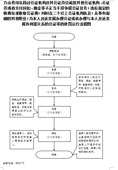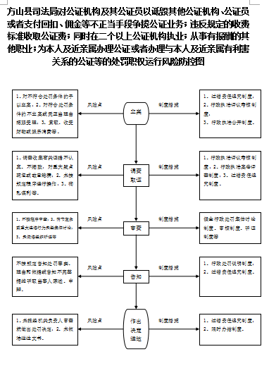| 行政处罚 | 01269077-4 -CF-0010 | 对公证机构及其公证员以诋毁其他公证机构、公证员或者支付回扣、佣金等不正当手段争揽公证业务;违反规定的收费标准收取公证费;同时在二个以上公证机构执业;从事有报酬的其他职业;为本人及近亲属办理公证或者办理与本人及近亲属有利害关系的公证等的处罚 | 【法律】《中华人民共和国公证法》第四十一条 | 1、立案责任:发现和受理移交的违法行为,予以审查,决定是否立案。2、调查责任:立案的,指定专人负责,及时组织调查取证,与当事人有直接利害关系的应当回避。执法人员不得少于两人,调查时应出示执法证件,允许当事人辩解陈述。执法人员廉洁奉公保守有关秘密。 3、审查责任;审查案件调查报告,对案件违法事实、证据、调查取证程序、法律适用、处罚种类和幅度、当事人陈述和申辩理由等方面进行审查,提出处理意见(主要证据不足时,以适当的方式补充调查)。4、告知责任:作出行政处罚决定前,应制作《行政处罚告知书》送达当事人,告知违法事实及其享有的陈述、申辩等权利。符合听证规定的,制作《行政处罚听证告知书》。5、决定责任:制作行政处罚决定书,载明行政处罚告知、当事人陈述申辩或者听证情况等内容。6、送达责任:行政处罚决定书按法律规定的方式送达当事人。7、执行责任:依照生效的行政处罚决定,进行处罚。 8、其他责任。 | 1、超越或者滥用监督职权的;应予受理而不受理;2、对知悉的财政、财务和会计违法行为未及时处置的;群众举报或发现违法线索置之不理;3、违反规定程序实施监督检查的; 4、泄露监督检查中知悉的国家秘密、商业秘密和个人隐私的;5、索贿、受贿、利用监督检查工作之便谋取私利的;6、指派不具备法定行政执法资格的人员实施行政处罚的; 7、擅自设立处罚种类或者改变处罚幅度、范围的;不规定时限告知和作出决定;8、不按时执行的;违反“罚缴分离”规定,擅自收取罚款的;9、对当事人进行罚款、没收财物等行政处罚不使用法定单据的;10、依法应当移送司法机关处理而不移送的;11、行政机关将罚款、没收的违法所得或者财物截留、私分或者变相私分的;12、执法人员利用职务上的便利,索取或者收受他人财物、收缴罚款据为己有的;13、行政机关使用或者损毁扣押的财物,对当事人造成损失的;14、行政机关违法实行检查措施或者执行措施,给公民人身或者财产造成损害、给法人或者其他组织造成损失的;15、在行政处罚过程中滥用职权、玩忽职守、徇私舞弊的;16、其他违法违规行为 | 【法律】《中华人民共和国行政处罚法》第五十五条、五十六条、五十七条、五十八条、五十九条、六十条、六十一条、六十二条;《公务员法》第五十三至五十五条;【行政法规】《行政机关公务员处分条例》(国务院第495号令);【地方性法规】《山西省行政执法条例》第十三条、第四十至四十二条;【党内法规】《中国共产党纪律处分条例》;【部门规章】《司法行政机关行政处罚程序规定》(司法部令第51号)第三十三条;【规范性文件】《山西省行政机关及其工作人员行政过错责任追究暂行办法 》、《吕梁市行政执法责任追究暂行办法》第八条、第十九条、第二十四、第二十五条。 | 一、行政处理: 1、诫勉谈话或者责令书面检讨; 2、通报批评; 3、暂扣行政执法证件;4、责令离岗培训;5、调离执法岗位;6、取消执法资格; 7、依法追偿部分或者全部行政赔偿费用。二、行政处分:警告、记过、记大过、降级、撤职、开除。三、党纪处分:警告、严重警告、撤销党内职务、留党察看、开除党籍。四、其他法律责任 | ||