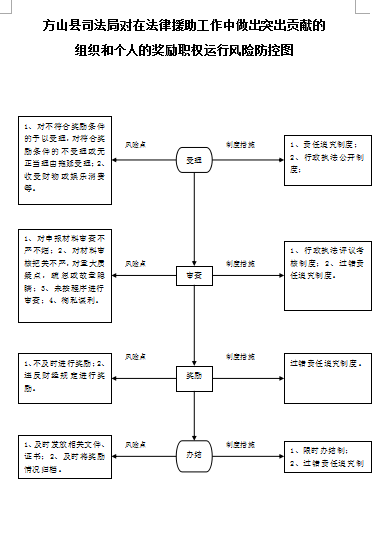 | 行政奖励 | 01269077-4 -JL-0001 | 对在法律援助工作中做出突出贡献的组织和个人的奖励 | 【行政法规】《法律援助条例》(国务院令第385号)第九条 | 1、根据法律援助工作实际,制定、发布奖励方案、信息;2、依法做好申报受理;3、认真做好法律援助奖励审查;4、及时作出奖励等 | 1、滥用职权、玩忽职守造成严重后果的;2、无法定依据或者超越法定权限实施法律援助奖励的;3、在实施法律援助奖励过程中谋取不正当利益的;4、审查不严、违反法律援助奖励程序实施奖励的;5、非正当目的实施奖励的;6、其它违纪行为。 | 【法律】《公务员法》第五十三至五十五条;【行政法规】《行政机关公务员处分条例》(国务院第495号令);【地方性法规】《山西省行政执法条例》第十三条、第四十至四十二条;【党内法规】《中国共产党纪律处分条例》;【规范性文件】《山西省行政机关及其工作人员行政过错责任追究暂行办法 》、《吕梁市行政执法责任追究暂行办法》第十五条、第十九条、第二十四、第二十五条 | 一、行政处理: 1、诫勉谈话或者责令书面检讨; 2、通报批评等。二、行政处分:警告、记过、记大过、降级、撤职、开除。三、党纪处分:警告、严重警告、撤销党内职务、留党察看、开除党籍。四、其他法律责任。 | ||