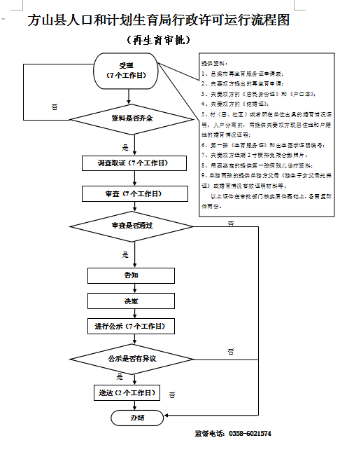 行政许可 | 012690141-XK-0001 | 再生育审批 | 【法律】《中华人民共和国人口与计划生育法》第十八条法》第十八条。 【地方性法规】《山西省人口和计划生育条例》第十一条、第十五条。 | 1、受理责任:公示再生育审批应当提交的材料,一次性告知补正材料,依法受理或不予受理(不予受应当告知理由)。 2、审查责任:按照法律、法规规定的再生育审批条件和标准,对书面申请材料真实性和合法性进行审核;提出审查意见,组织病残儿医学鉴定。 3、决定责任;作出行政许可或不予行政许可的决定(不予许可的应书面说明理由.并告知当事人享有依法申请行政复议或提起行政诉讼的权利)。 4、送达责任:对许可的制发送达《再生育服务证》,对不予许可的制发送达《不予批准再生育通知书》。 5、事后监管责任:对领取《再生育证》人员进行跟踪随访服务。 6、其他责任:法律法规规章规定应履行的责任。