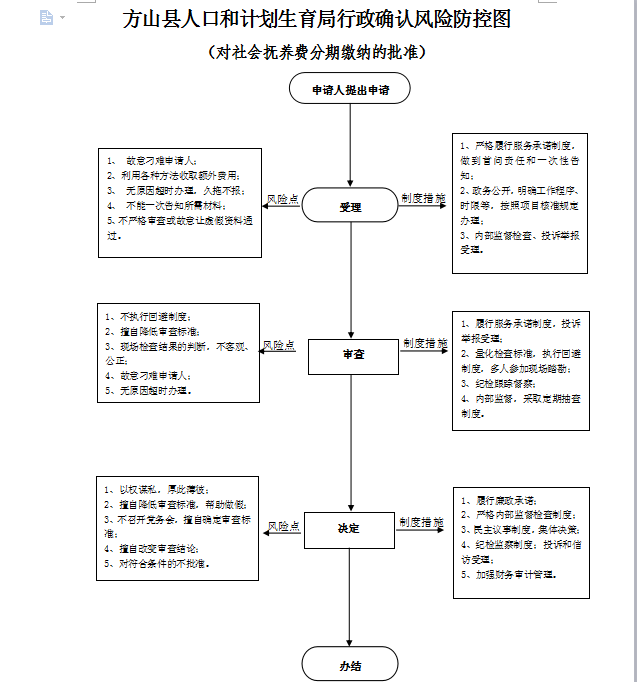 | 行政确认 | 012690141-QR-0001 | 对社会抚养费分期缴纳的批准 | 【法律】《社会抚养费征收管理办法》第六条第二款。 【地方性法规】《山西省社会抚养费征收管理办法》第八条。 | 1、受理责任:根据当事人申请,依法受理或不予受理(不予受理应当告知理由)。 2、审查责任:对照条件和标准对当事人书面申请进行审核。 3、决定责任:作出准予或不准予决定,法定告知具体时间、金额(不予确认的应当书面告知理由)。 4、其他法律法规规章文件规定应履行的责任。 | 1、对申请人符合确认规定条件的申请不予受理、不予确认或不在规定期限内作出确认核准的; 2、对不符合确认规定条件的申请准予确认或超越法定权限作出确认的; 3、在办理过程中发生腐败行为的; 4、其他法律法规规章文件规定应履行的责任。 | 【法律】《中华人民共和国行政处罚法》第七章。 【党内法规】《中国共产党纪律处分条例》第九条、第十条。 【规范性文件】《山西省行政机关及其工作人员行政过错责任追究暂行办法 》、《吕梁市行政执法责任追究暂行办法》第七条、第二十三条、第二十四条、第二十五条。 | 一、行政处理 1、诫勉谈话或者责令书面检讨; 2、通报批评; 3、暂扣行政执法证件; 4、责令离岗培训; 5、调离执法岗位 6、取消执法资格; 7、依法追偿部分或者全部行政赔偿费用。 二、行政处分:警告、记过、记大过、降级、撤职、开除。 三、党纪处分:警告、严重警告、撤销党内职务、留党察看、开除党籍。 四、其他法律责任。 | |