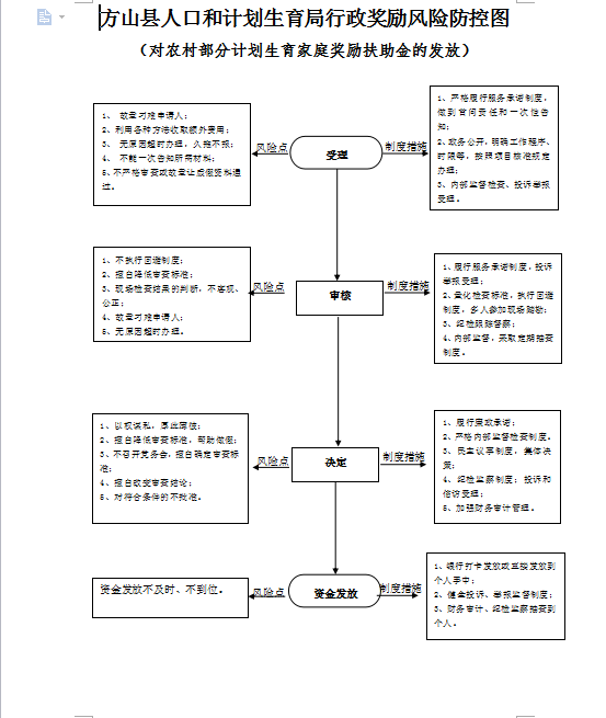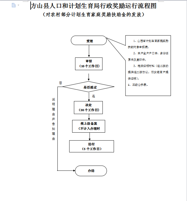 | 行政奖励 | 012690141-JL-0001 | 对农村部分计划生育家庭奖励扶助金的发放 | 【地方性法规】《山西省人口和计划生育条例》。 | 1、受理责任:公示家庭奖励扶助对象依法应当提交的材料一次性告知; 2、审查责任;对提供的家庭奖励扶助对象材料进行审查核实,是否具备资格包括奖励的理由,核实依据,法律依据等; 3、报上级备案责任:对申请人的材料加注同意意见后,报上级备案; 4、支付责任:依按规定制度支付扶助金。 | 1、对申请人资料进行审查; 2、对符合奖励扶助条件的不予确认上报;对不符合条件的予以确认上报的; 3在办理过程中存在腐败现象的。 | 【地方性法规】《山西省人口和计划生育条例》第五十八条、第五十九条、第六十条。 【规范性文件】《山西省行政机关及其工作人员行政过错责任追究暂行办法 》、《吕梁市行政执法责任追究暂行办法》第七条、第二十三条、第二十四条、第二十五条。 【党内法规】《中国共产党纪律处分条例》。 | 一、行政处理: 1、诫勉谈话或者责令书面检讨; 2、通报批评; 3、暂扣行政执法证件; 4、责令离岗培训; 5、调离执法岗位; 6、取消执法资格; 7、依法追偿部分或者全部行政赔偿费用。 二、行政处分:警告、记过、记大过、降级、撤职、开除。 三、党纪处分:警告、严重警告、撤销党内职务、留党察看、开除党籍。 四、其他法律责任。 | |