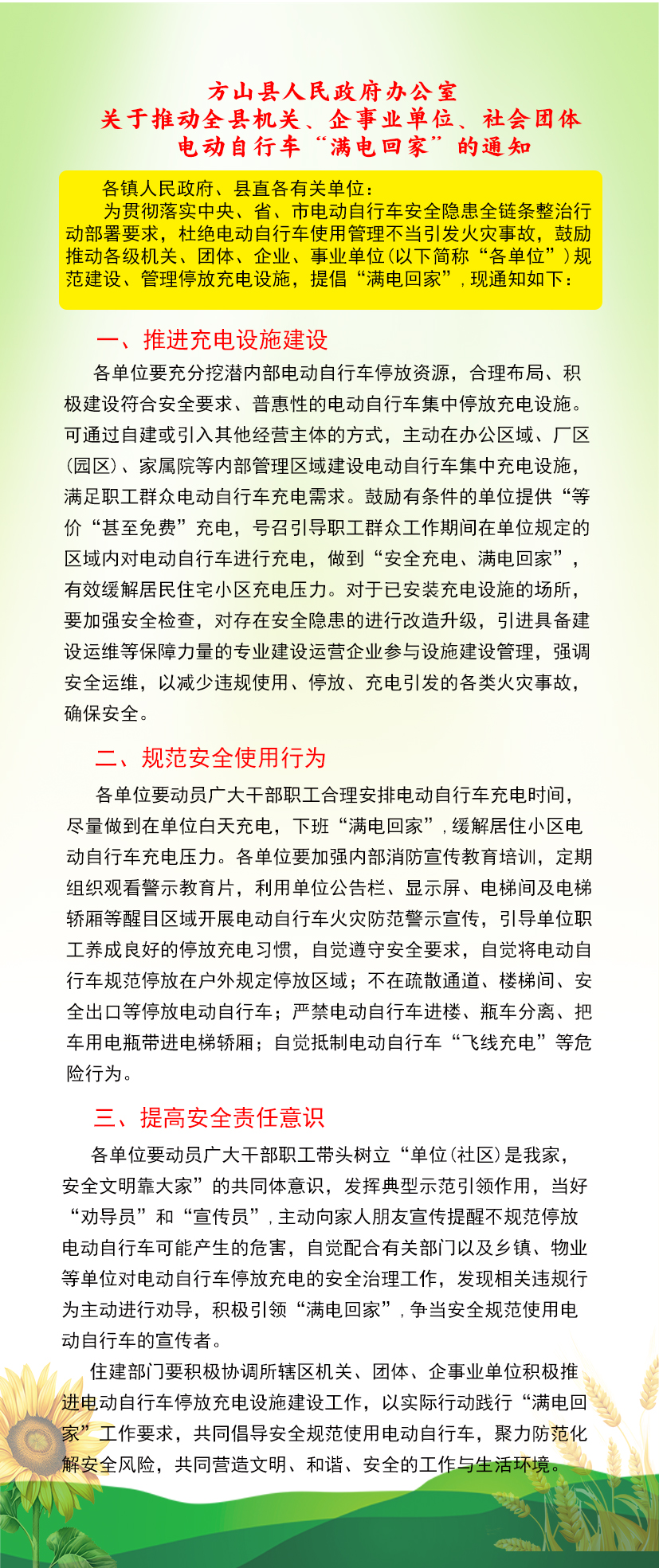 方山县人民政府办公室 关于推动全县机关、企事业单位、社会团体 电动自行车“满电回家”的通知