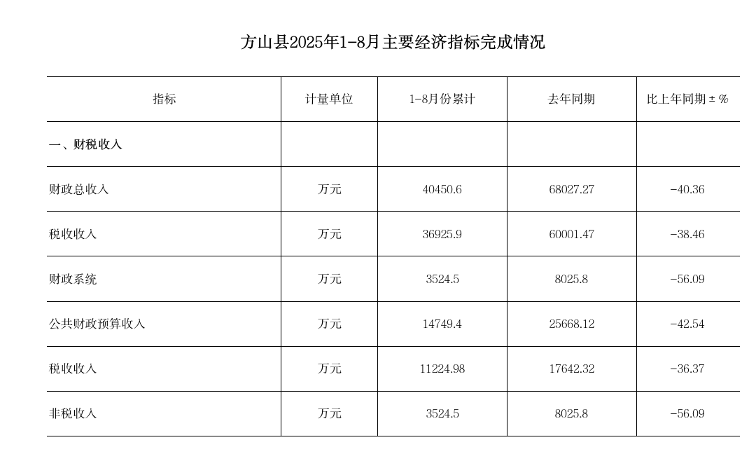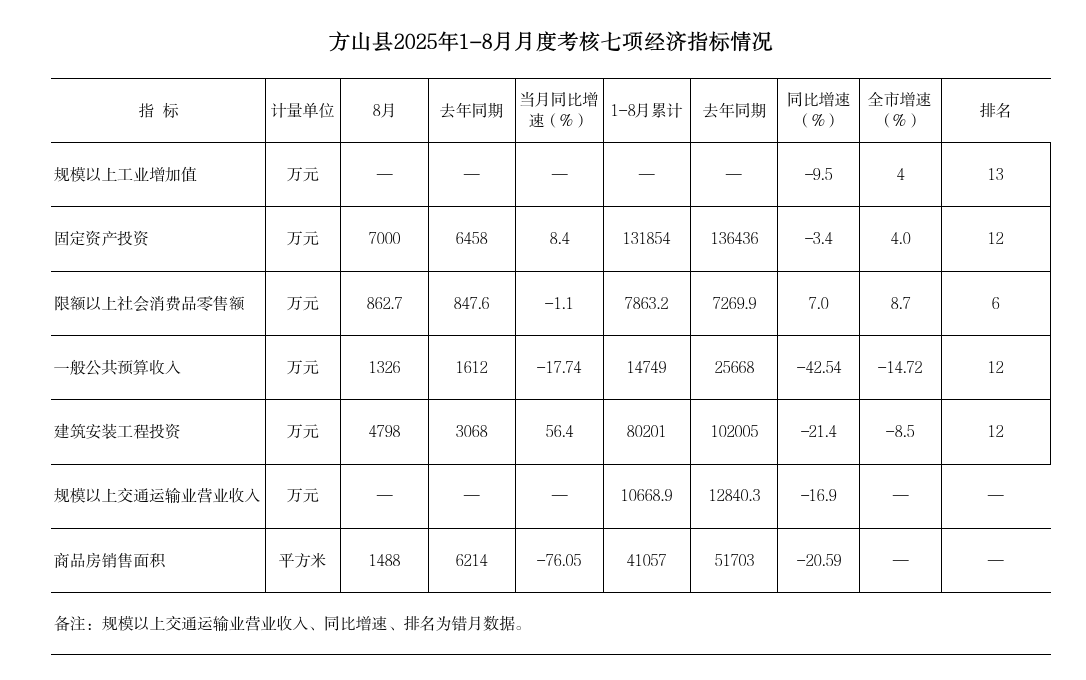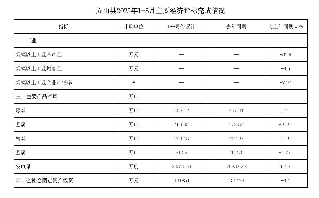 方山县2025年1-8月主要经济指标完成情况