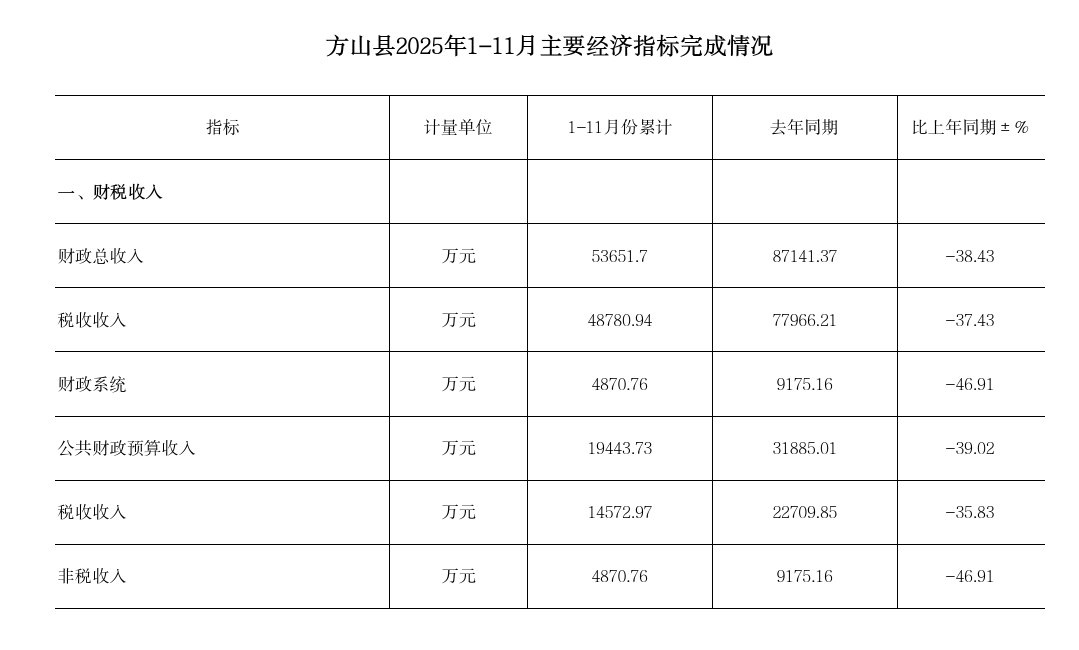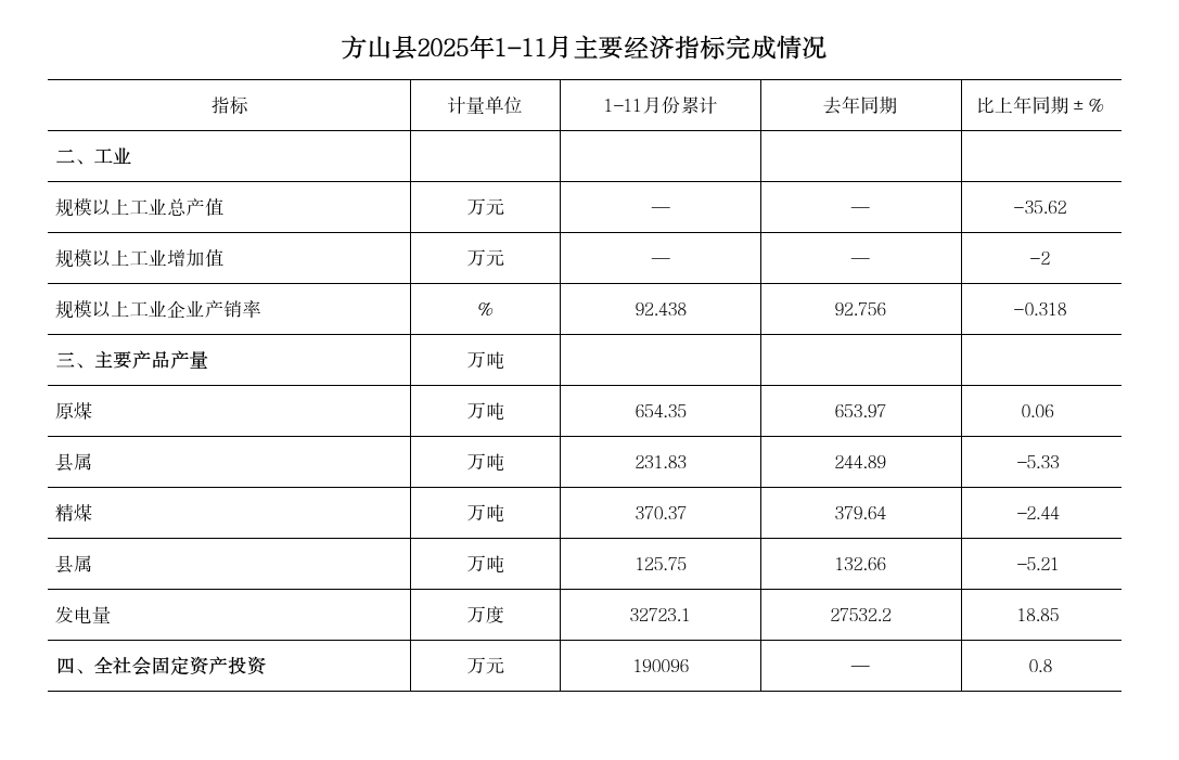 方山县2025年1-11月主要经济指标完成情况