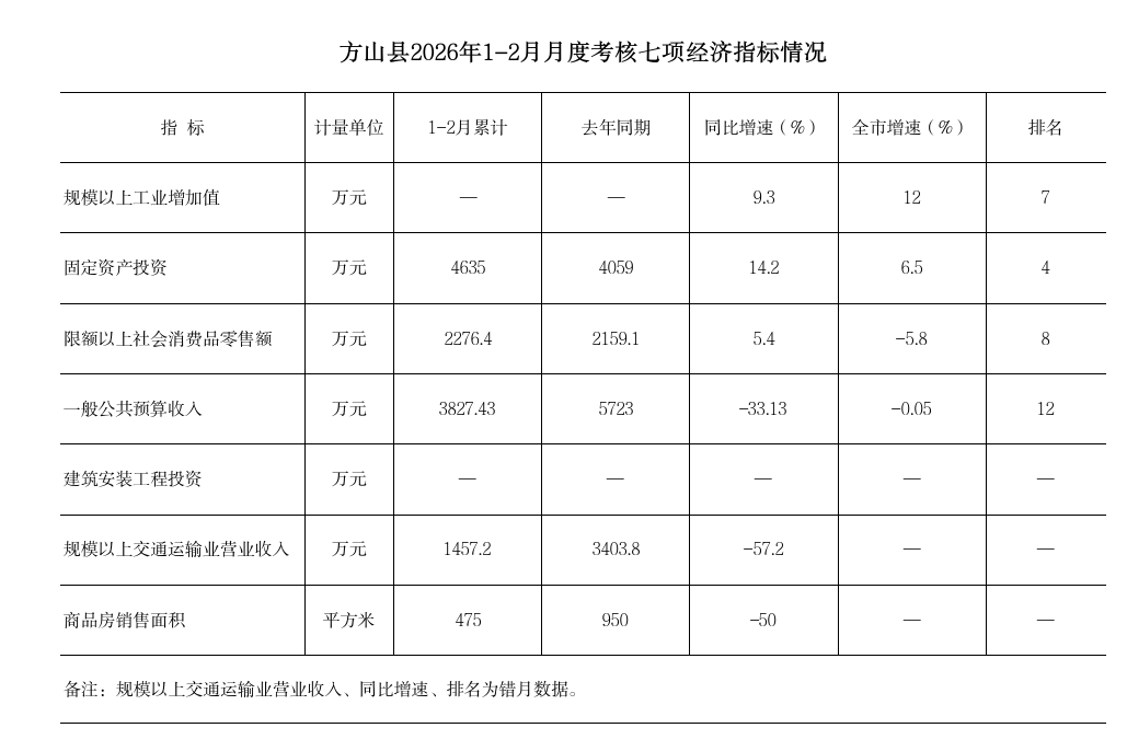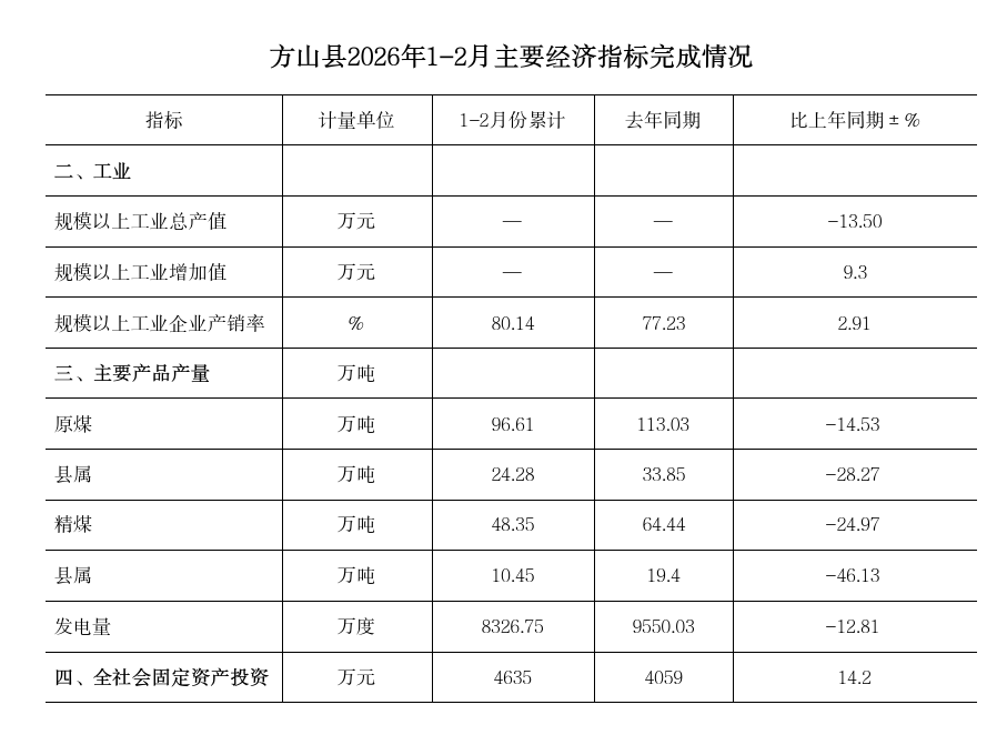 方山县2026年1-2月主要经济指标完成情况