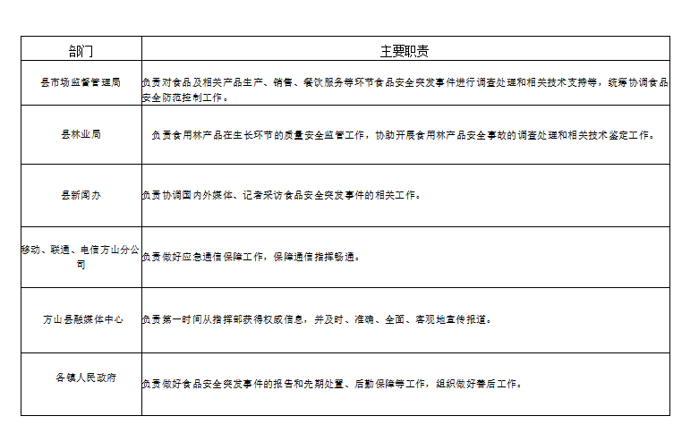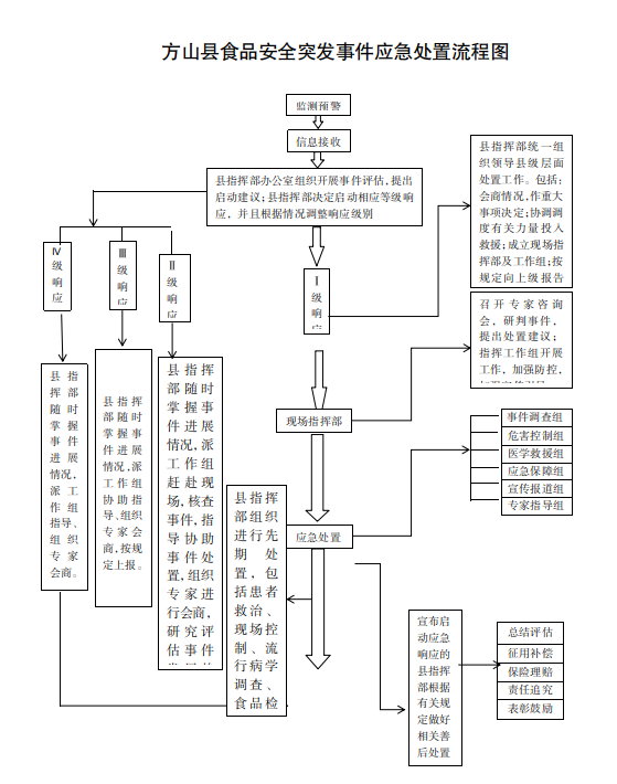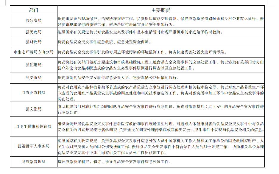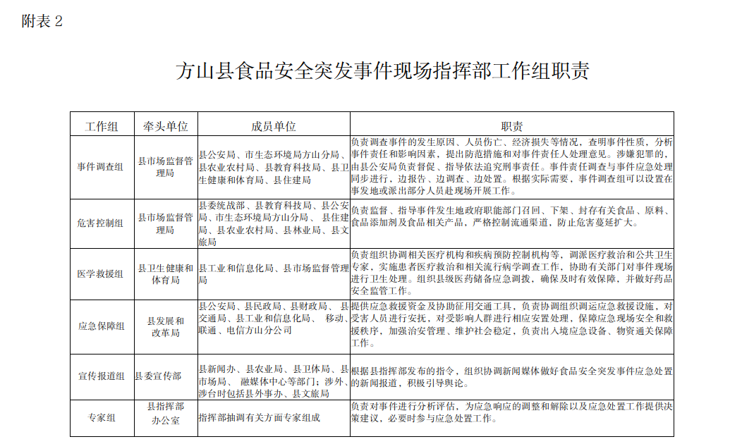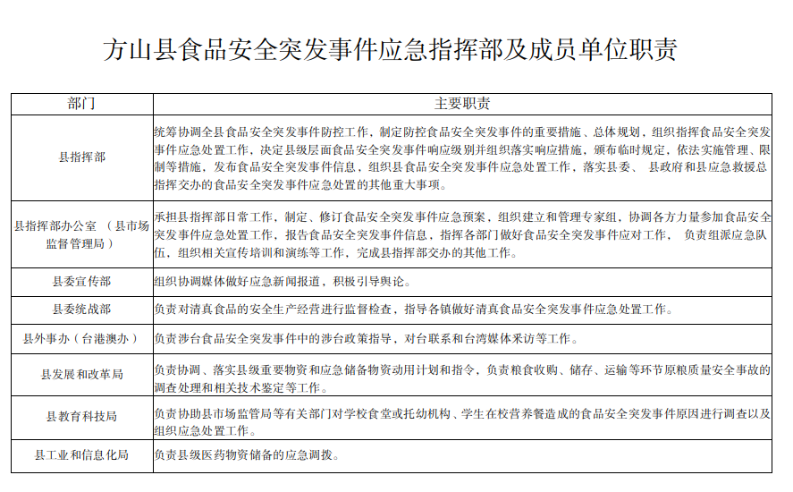 县食品安全突发事件的应急指挥机构为县市场监管事件应急指挥部(以下简称县指挥部)。总指挥由分管市场监管工作的副县长担任,副总指挥由县政府办主任、县市场监督管理局、县应急管理局、县农业农村局、县卫生健康和体育局主要负责人、县公安局副局长担任。县委宣传部、县委统战部、县新闻办、县发展和改革局、县教育科技局、县工信局、县公安局、县民政局、县财政局、市生态环境局方山分局、县住房和城乡建设局、县交通局、县农业农村局、县文旅局、县卫生健康和体育局、县退役军人事务局、县应急管理局、县市场监督管理局、县林业局、移动、联通、电信方山分公司为成员单位。