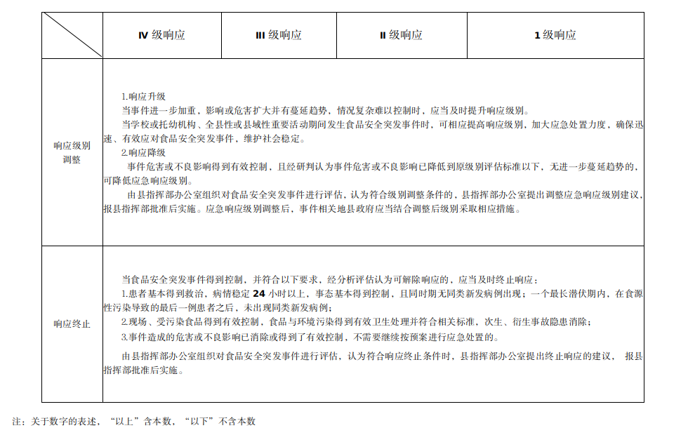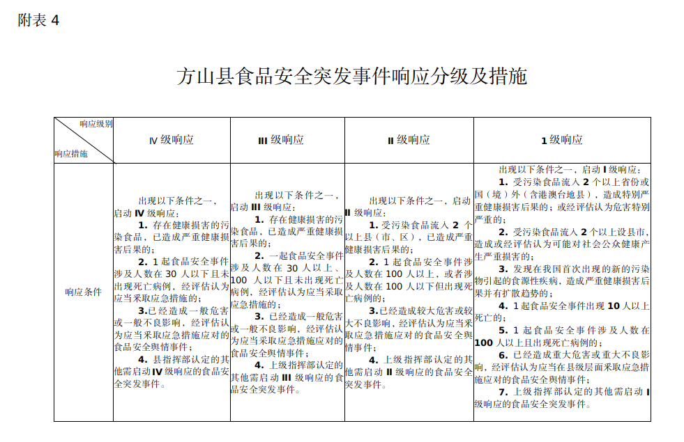 根据食品安全突发事件的危害程度和应对工作需要,县级层面应急响应分为I级、II级、III级、IV级。