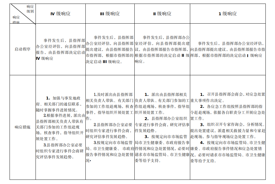 响应条件、启动程序、响应措施、响应级别调整及终止见附表4。