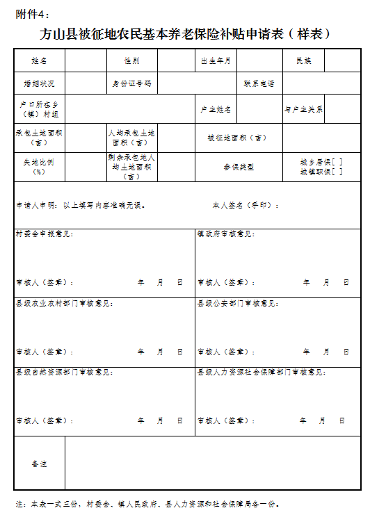 4.方山县被征地农民基本养老保险补贴申请表(样表)